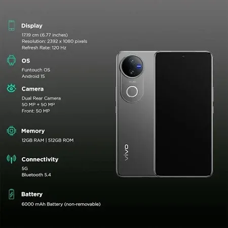 The Vivo V50 5G is a stylish and powerful smartphone from Vivo, featuring a sleek Titanium Grey finish. It comes with 12GB RAM and a massive 512GB storage, ensuring smooth multitasking and ample space for apps and media. The device supports 5G connectivity for fast internet speeds and is powered by a capable processor for efficient performance. With a vibrant display, advanced camera features, and long battery life, the V50 5G is designed for both work and entertainment. |